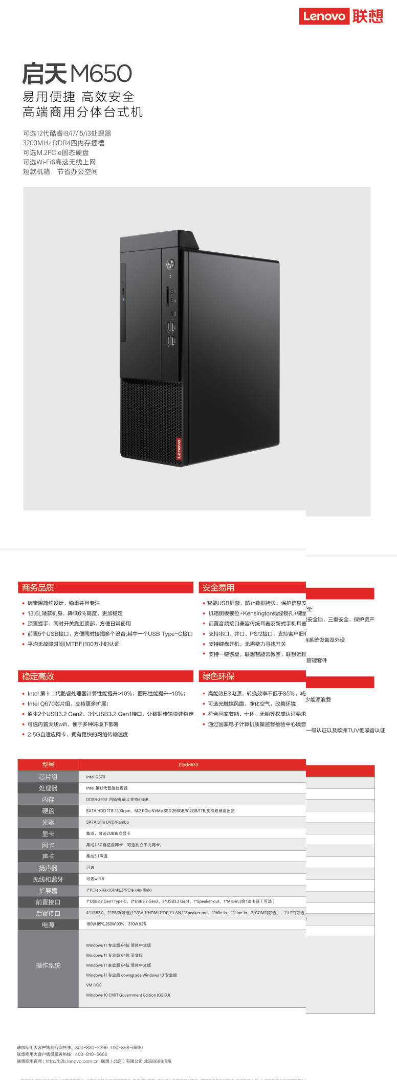 联想启天M650-A245联想商用分体机/Intel酷睿i5-12500(六核3.0GHz)/Q670主板芯片组 /16GB-DDR4内存 /256GB SSD+1TB 机械硬盘 /集显/DVDRW /260W 85%高能效电源 /USB键鼠 /联想一键恢复 /Win11 home /六年整机有限上门保修 /门到桌安装服务/ ThinkVision23.8吋显示器