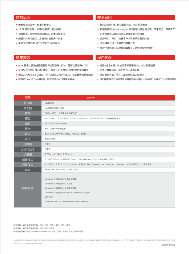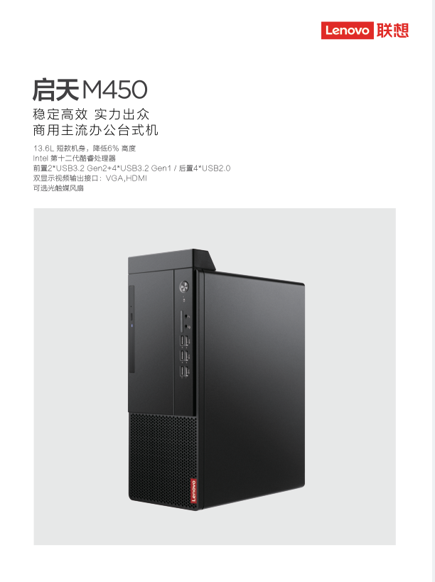 联想启天M450-A313联想商用分体机/Intel酷睿i5-12400(六核2.5GHz)/B660主板芯片组 /16GB-DDR4内存 /256GB SSD+1TB 机械硬盘 /集显/DVDRW /260W 85%高能效电源 /USB键鼠 /联想一键恢复 /Win11 home /六年整机有限上门保修 /门到桌安装服务/ ThinkVision23.8吋显示器