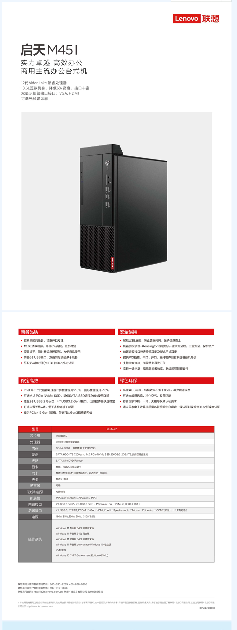 联想 启天M45I-A009台式计算机( i5-12400/8GB/256SSD+1T/260W电源/USB键鼠/23.8寸显示器/Win11H/三年质保 )