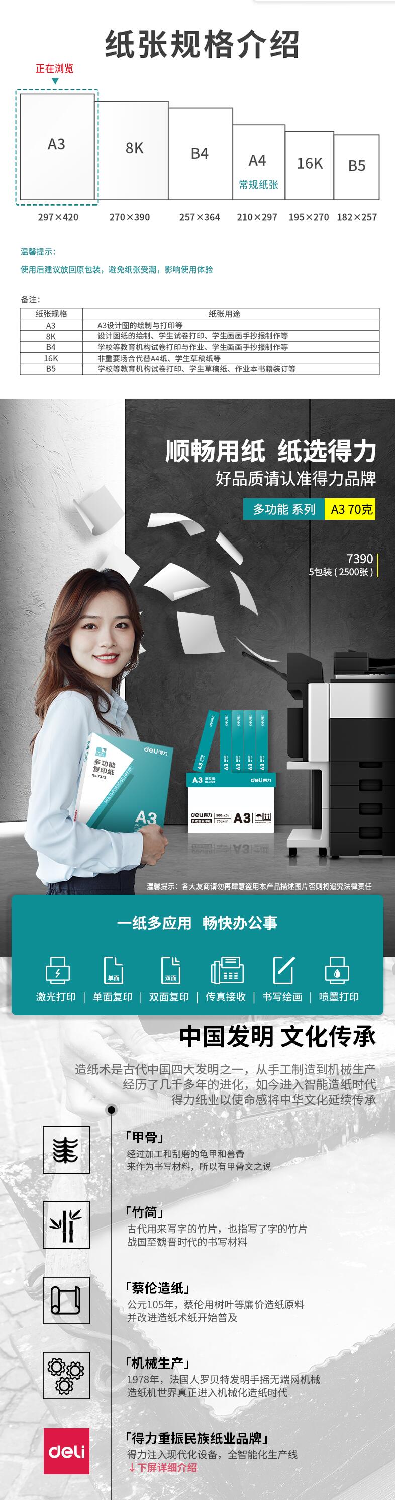 得力7397复印纸 A3 80G 500张/包 单位:包