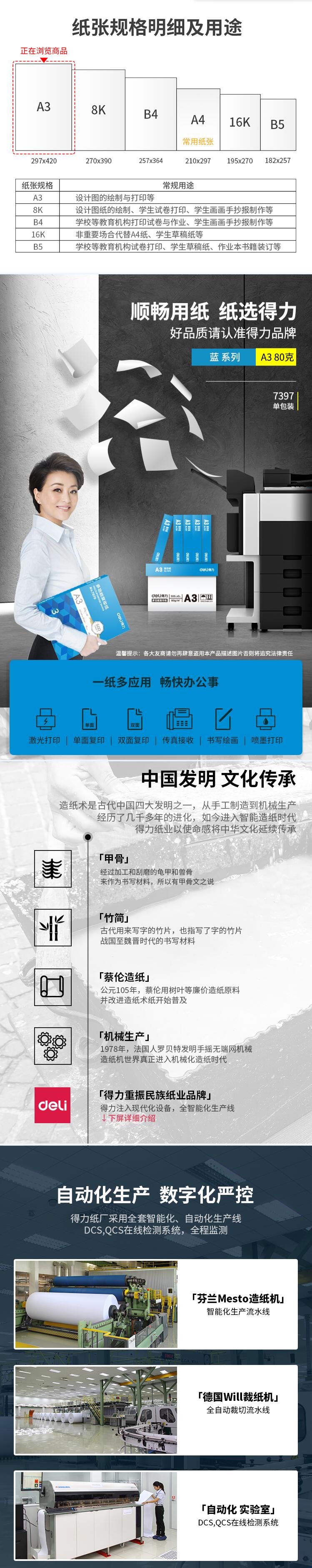 得力7397复印纸 A3 80G 500张/包 单位:包