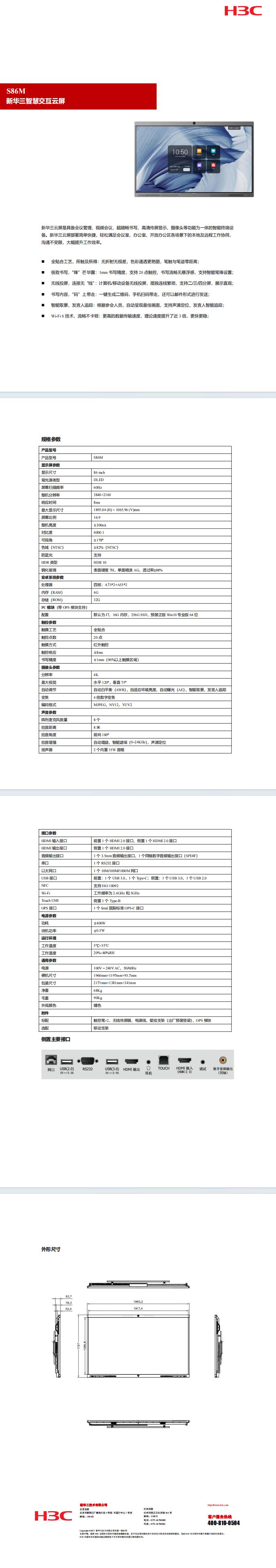 新华三(H3C)S86M 智慧交互云屏86英寸4K会议平板办公触控一体机(含无线传屏器/双系统/I5-OPS模块/触控笔/原厂3年质保)