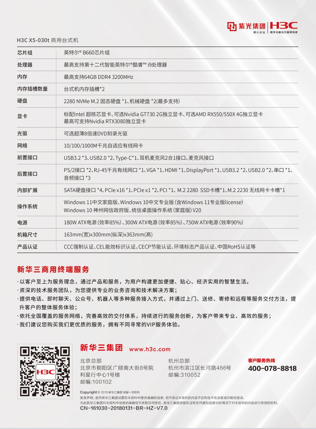 H3C X5-030t台式机(I5-12500/16G/256G SSD/GT 730 2G/1TB HDD/180W/WIN11/3年保+23.8寸显示器,1年大客户尊域铂金服务)
