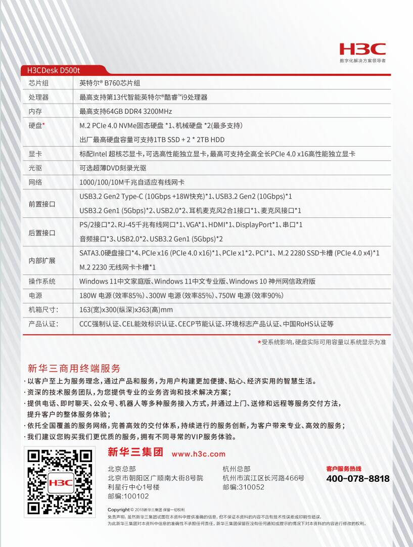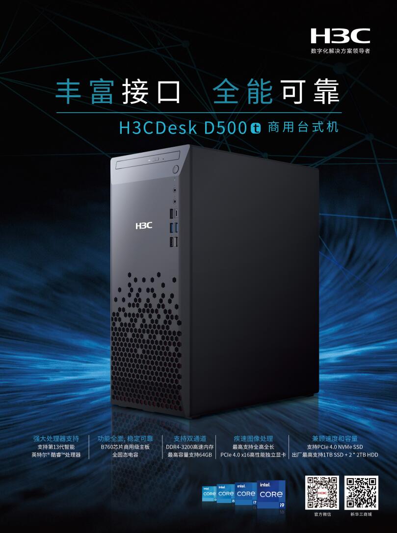 H3CDesk D500t台式机(i5-13400/16GB/512GB SSD/1TBHDD/180W/WIFI 6/Non ODD/Win11 HB/B760 17L/23.8寸显示器)