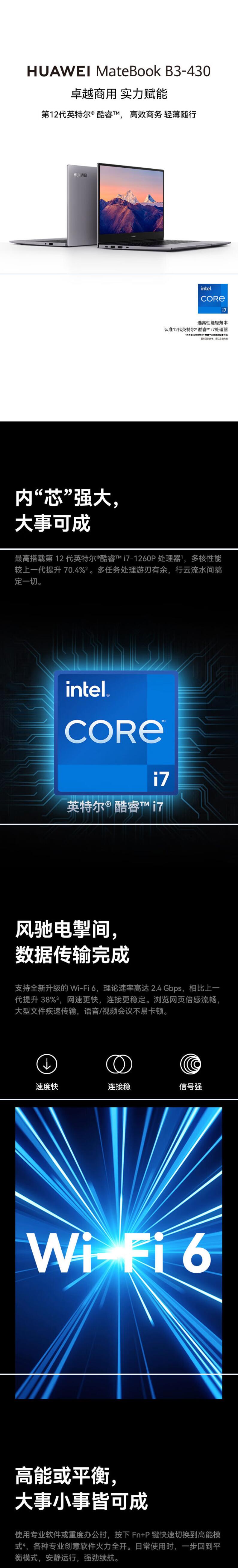 华为 MateBook笔记本 B3-430酷睿™ i71260P 处理器/WIN11HOME/集显Intel® Iris® Xe Graphics/16GB/512G SSD/14英寸1920x1080像素 WIFI6/蓝牙/56Wh/MINIRJ45含线/ 720P隐藏式摄像头/USB3.2 Gen2*1/USB2.0*1/TPM加密/约1.38Kg/3年上门