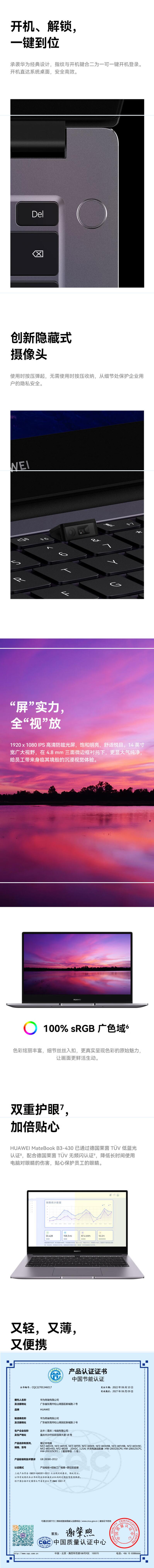 当前位置: 首页 > 政采分类 > 电脑、办公设备 > 电脑整机 > 台式电脑 > 华为 MateBook笔记本 B3-430酷睿™ i71260P 处理器/WIN11HOME/集显Intel® Iris® Xe Graphics/16GB/512G SSD/14英寸1920x1080像素 WIFI6/蓝牙/56Wh/MINIRJ45含线/ 720P隐藏式摄像头/USB3.2 Gen2*1/USB2.0*1/TPM加密/约1.38Kg/3年上门