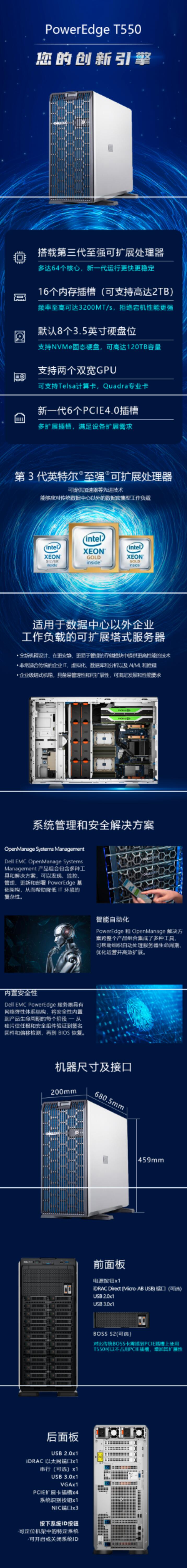 戴尔/dell poweredge t550 服务器(金牌5320*2/2*64gb内存/2*960gb ssd/4*24tb sas硬盘、1400w电源27寸显示器/五年保修)x单位: 台
