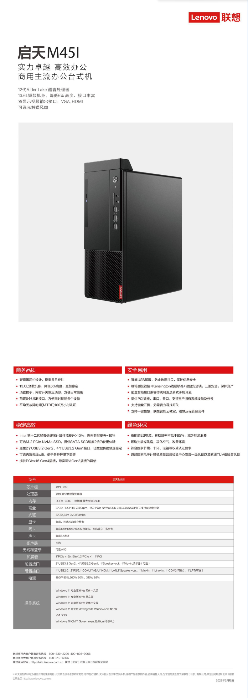 联想启天M45I-A014(I5-12400/16G/1T+512GSSD/无光驱/集成/WIN11-HOME/主机+23.8寸/三年保)