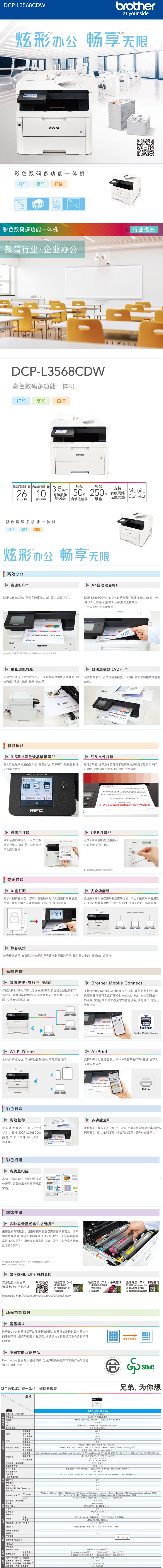 兄弟 DCP-L3568CDW彩色多功能一体机 A4自动打印双面 复印 扫描 红头文件打印 支持有线/无线网络打印